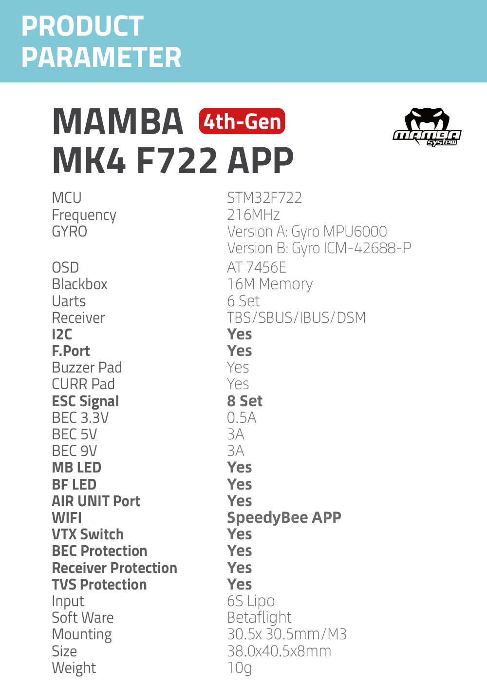 Specyfikacja MAMBA MK4 F722 APP FC WIFI (ICM42688P)